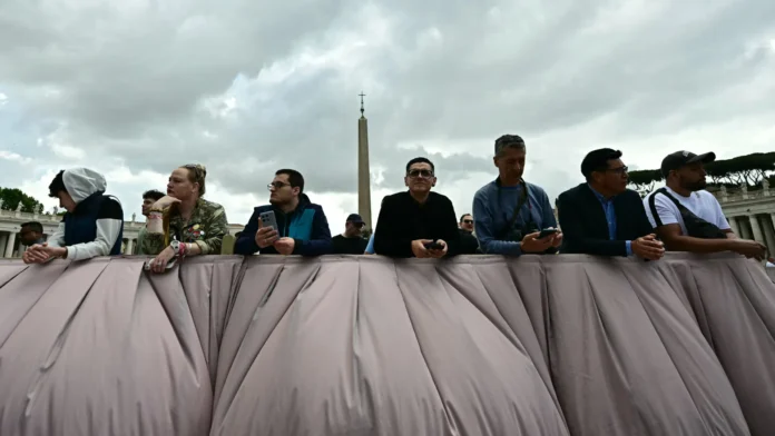 Pessoas de diversas partes do mundo caminham pela Via della Conciliazione em direção à praça, aguardando ansiosamente o anúncio do novo Pontífice.
