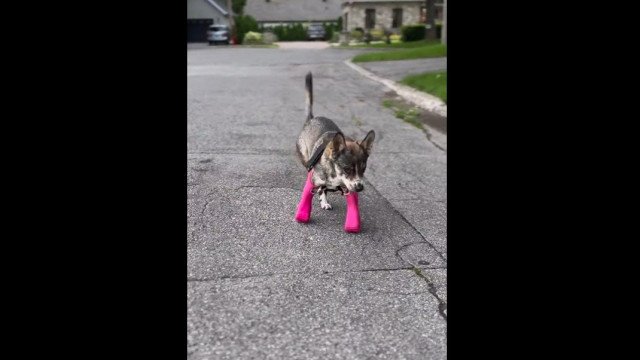 No vídeo, é possível ver o cãozinho mancando com o apoio apenas das patas traseiras. Em seguida, sua dona coloca as próteses para que o animal tenha a chance de caminhar normalmente.