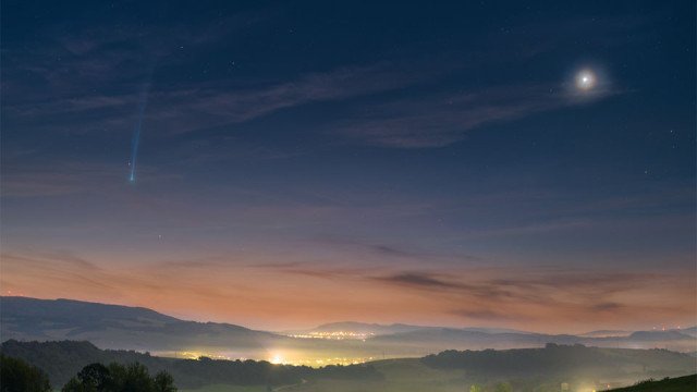 A fotografia foi captada por Petr Horálek na Eslováquia e mostra o C/2023 P1 (Nishimura) no lado esquerdo enquanto, do lado direito, é possível observar o planeta Vênus.