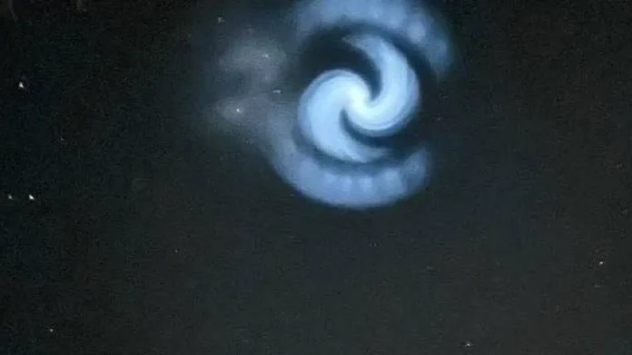 Nesta noite, uma espiral brilhante surgiu sobre o Reino Unido/Europa, provavelmente devido ao combustível congelado liberado do segundo estágio de um foguete SpaceX após o lançamento. O padrão luminoso permaneceu visível por vários minutos antes de… pic.twitter.com/mehX8EWXJh