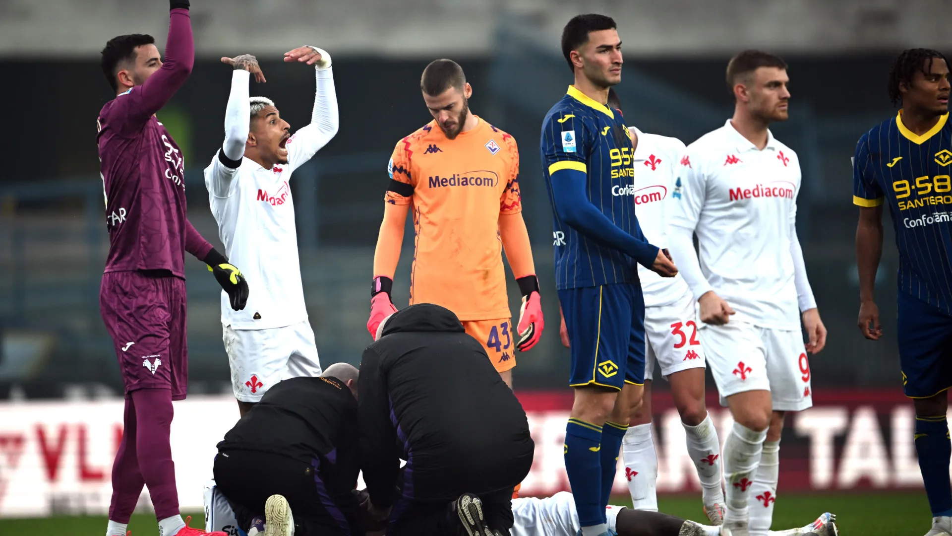 O jogo entre Hellas Verona e Fiorentina, neste domingo, foi marcado por um momento de tensão após Moise Kean desmaiar em campo. O atacante, que pertence à Juventus e está emprestado à Fiorentina, colapsou após sofrer uma joelhada na cabeça do zagueiro Dawidowicz. Imediatamente, os jogadores ao redor acionaram a equipe médica.
