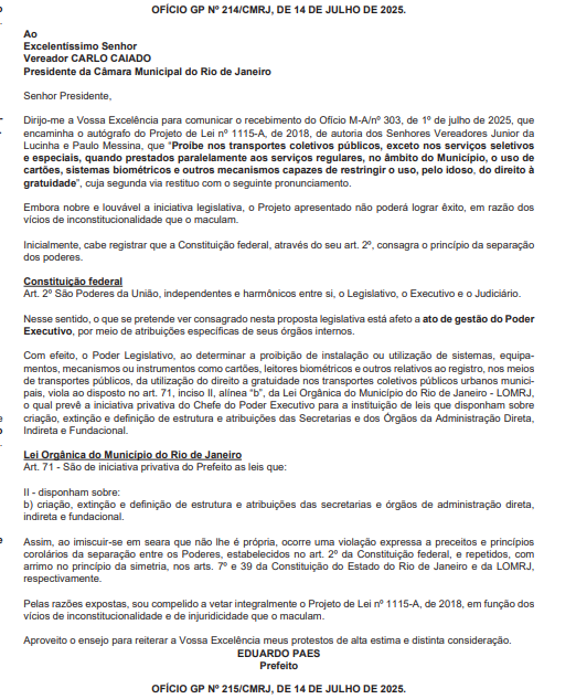 Com informações do Tempo Real. O prefeito Eduardo Paes (PSD) vetou, no Diário Oficial desta terça-feira (15), o projeto de lei que pretendia eliminar a obrigatoriedade do uso de cartões, sistemas biométricos e outros mecanismos para garantir a gratuidade aos idosos nos transportes coletivos públicos do Rio.