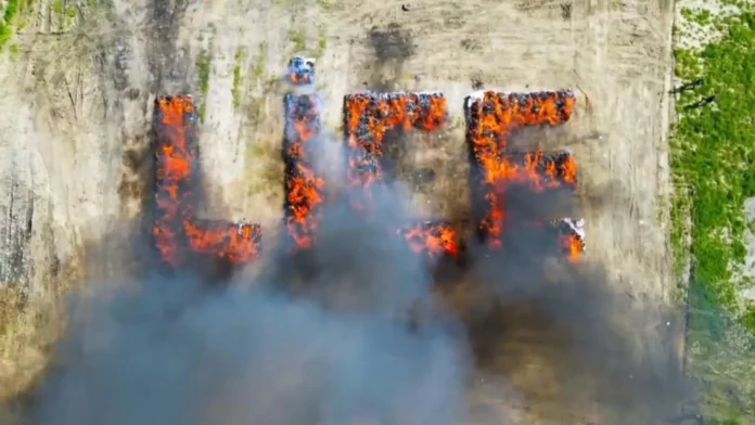 Durante a queima, a polícia usou mais de 200 litros de diesel e organizou os fardos de droga para formar a palavra “LICE”, o nome da cidade.
