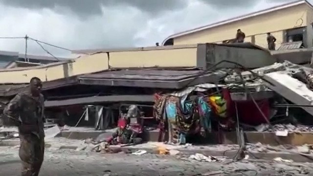 Buildings collapsed in Port Vila, Vanuatu after strong 7.4 earthquake.