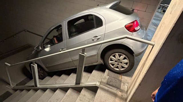 Depois do apito final da partida, um homem, acompanhado pela mulher e pelo filho, tentou deixar o estacionamento de carro, mas se enganou na saída e acabou descendo as escadas do local com o veículo. Resultado? O carro acabou ficando ‘preso’.