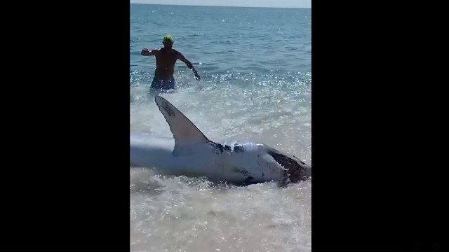 Em um vídeo registrado por um dos presentes, é possível observar um grupo de homens tentando arrastar o tubarão de volta para uma área de água mais profunda, segurando-o pela cauda.