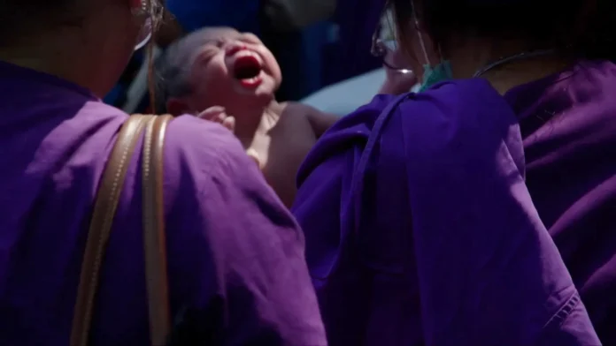 Foi durante a evacuação que acabou dando à luz, já em um estacionamento, deitada em uma maca e cercada pela equipe médica. O momento foi registrado em vídeo pela BBC.